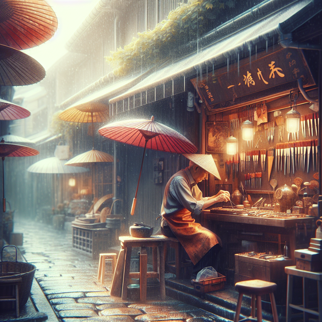 路地裏の傘修理店「雨上がりのシンフォニー」 街の喧騒を離れ、ひっそりと佇む傘修理店。雨上がりの午後は、どこからともなく懐かしい匂いが漂い、静かなシンフォニーが始まる。 古びた店構え 店先には、色とりどりの傘が並んでいる。...