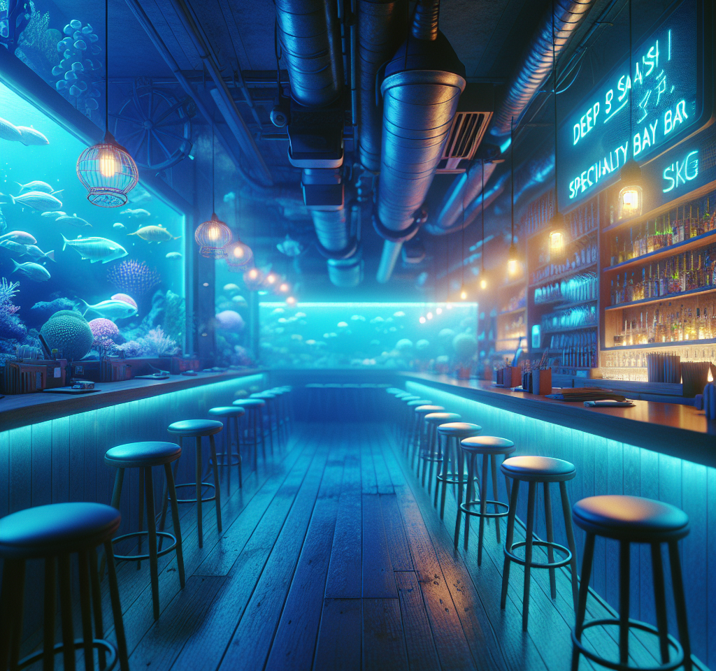 店内は、深い青色を基調とした照明で照らされ、壁には深海魚たちのシルエットが浮かび上がっている。カウンター席の奥には、巨大な水槽が設置されており、そこには普段目にすることのない奇妙な深海魚たちが、ゆったりと泳いでいる。客たちは、その光景を眺めながら、静かにグラスを傾けている。